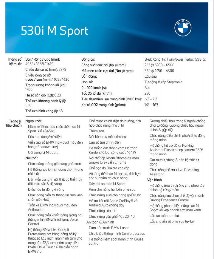 - Thể tích bình xăng BMW 530i MSport: 68 Lít.